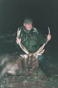 The evening I arrived for my hunt the weather was extreme but Errol knew precisely where to shoot a stag in these conditions. We walked to a hide he had previously prepared for these exact weather conditions. He pointed to the spot I was to watch. Within five minutes I spotted this ultra cautious stag on the edge of dense forest. He was casing the small clearing we were watching but the shot was not ideal. Errol whispered to wait. The stag appeared briefly, disappeared then reappeared. After fifteen minutes, just when we thought he had disappeared for good, he reappeared and walked into the edge of the clearing. When he stopped broadside I killed him with one shot.